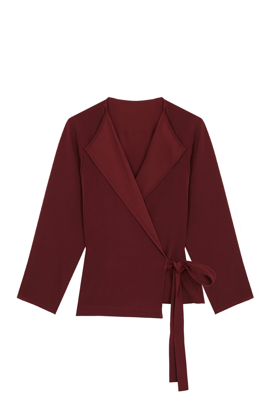 Blusa cruzada de manga larga con escote fluido. Lleva un cinturón que anuda en delantero o espalda.