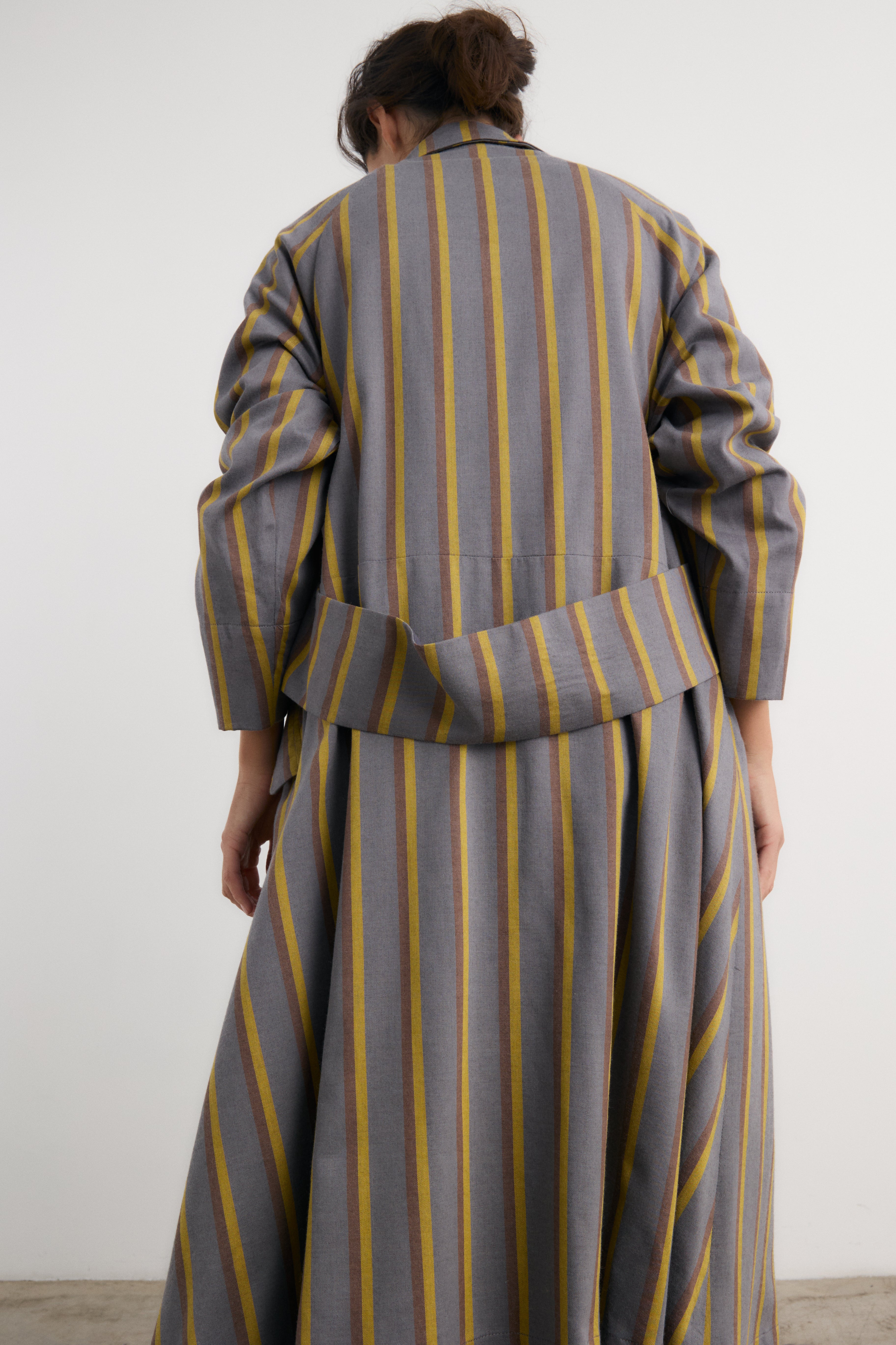 La gabardina Manuela es realmente un guardapolvos. Una prenda para, lleva lo que llevas debajo,elevarlo. Tiene solapa de gabardina y cinturón en la espalda, silueta con gran evasé gracias a que su espalda se abre en capa.